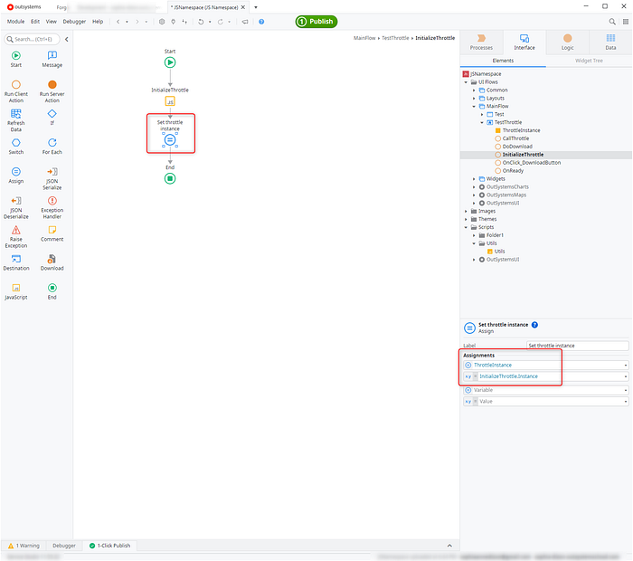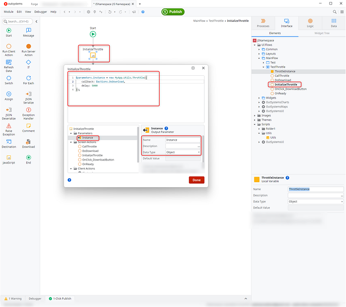 Create InitializeThrottle client action. Then drag JavaScript node, add output parameter with Object data type.