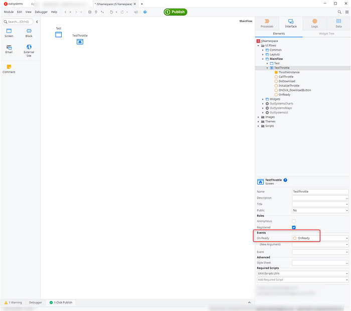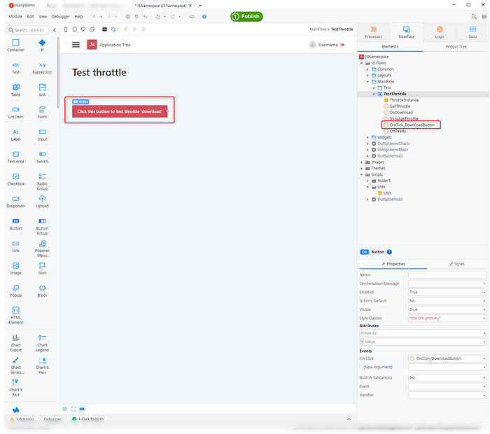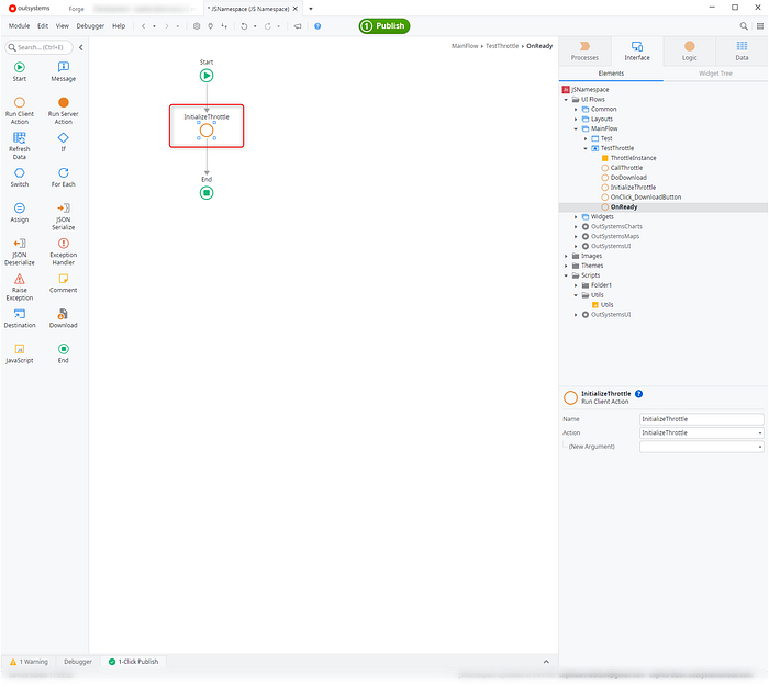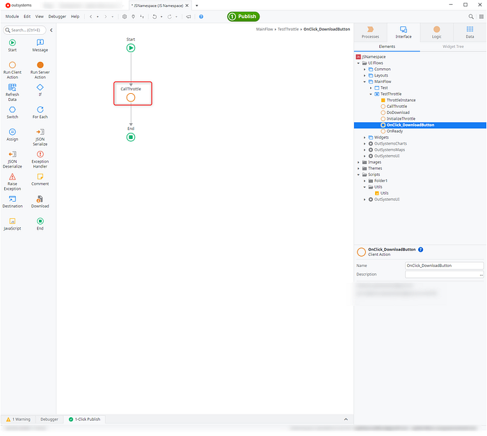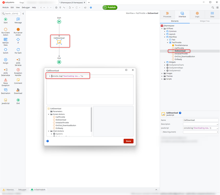 You also need to create a client action that calls the throttle instance. In this example create CallThrottle client action. Then drag another JavaScript node. Add the following script: