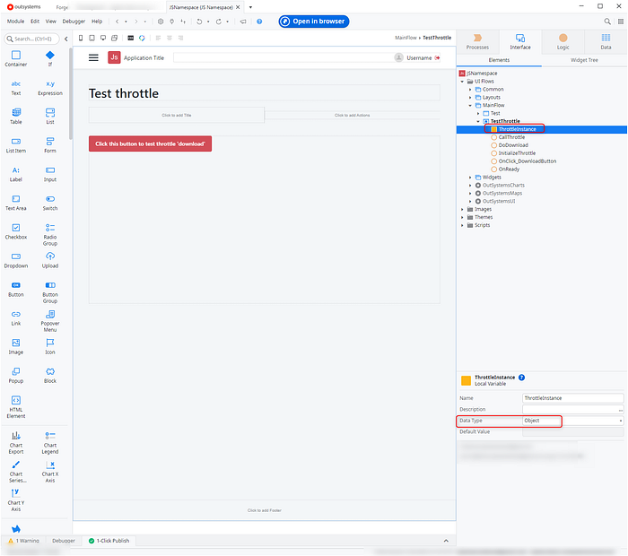 Create InitializeThrottle client action. Then drag JavaScript node, add output parameter with Object data type.
