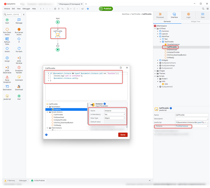 You also need to create a client action that calls the throttle instance. In this example create CallThrottle client action. Then drag another JavaScript node. Add the following script: