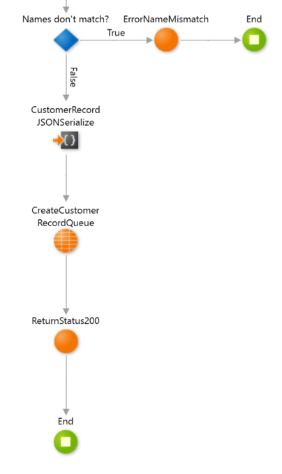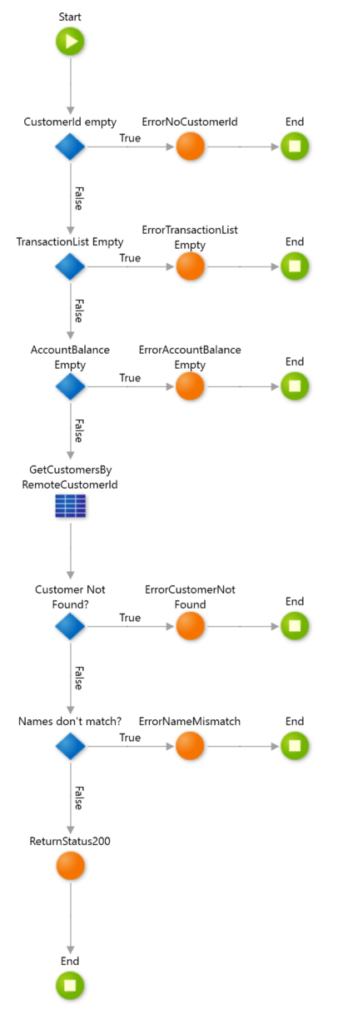 To create the first break in the transmission, we have an action in the API endpoint that first checks if the Customer is valid within the context of our application. We might check to make sure the Customer exists, and if the name matches what we already have. This simple validation is fast, and allows us to return a status code to the caller so they can complete their transaction.