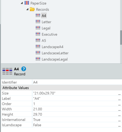Take a look at the identifier values of PaperSize, stored in the Size attribute. Notice how the values are defined? For example, the value “21.00×29.70” has the width and height values encoded in it. Strange, no?