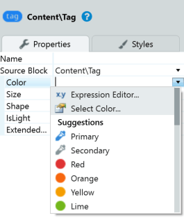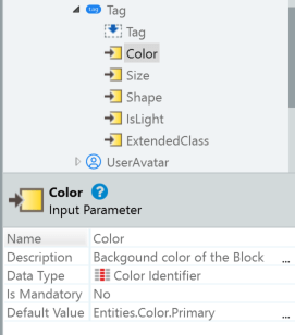 Each entity defines an Identifier type. For example, the User entity defines a User Identifier type. The Color static entity from OutSystems UI also defines a Color Identifier type. And the Tag component from OutSystems UI defines a Color input parameter of type Color Identifier.