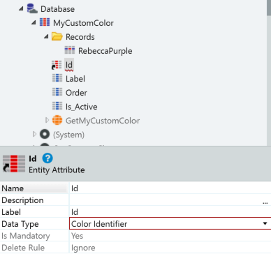 Let’s look back at the Color static entity. It has a Text identifier, so the first rule is respected. If we inspect OutSystems UI, we can verify that the GetColor action is never used, so the second rule checks out. So, we can conclude that the Color static entity is compatible with the constructible pattern.