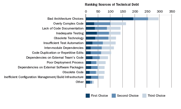 According to a study conducted by Neil Ernst in 2015, at Carnegie Mellon University, A Field Study of Technical Debt, most of the technical debt elements observed were related to bad architectural choices, followed by overly complex code and lack of code documentation.